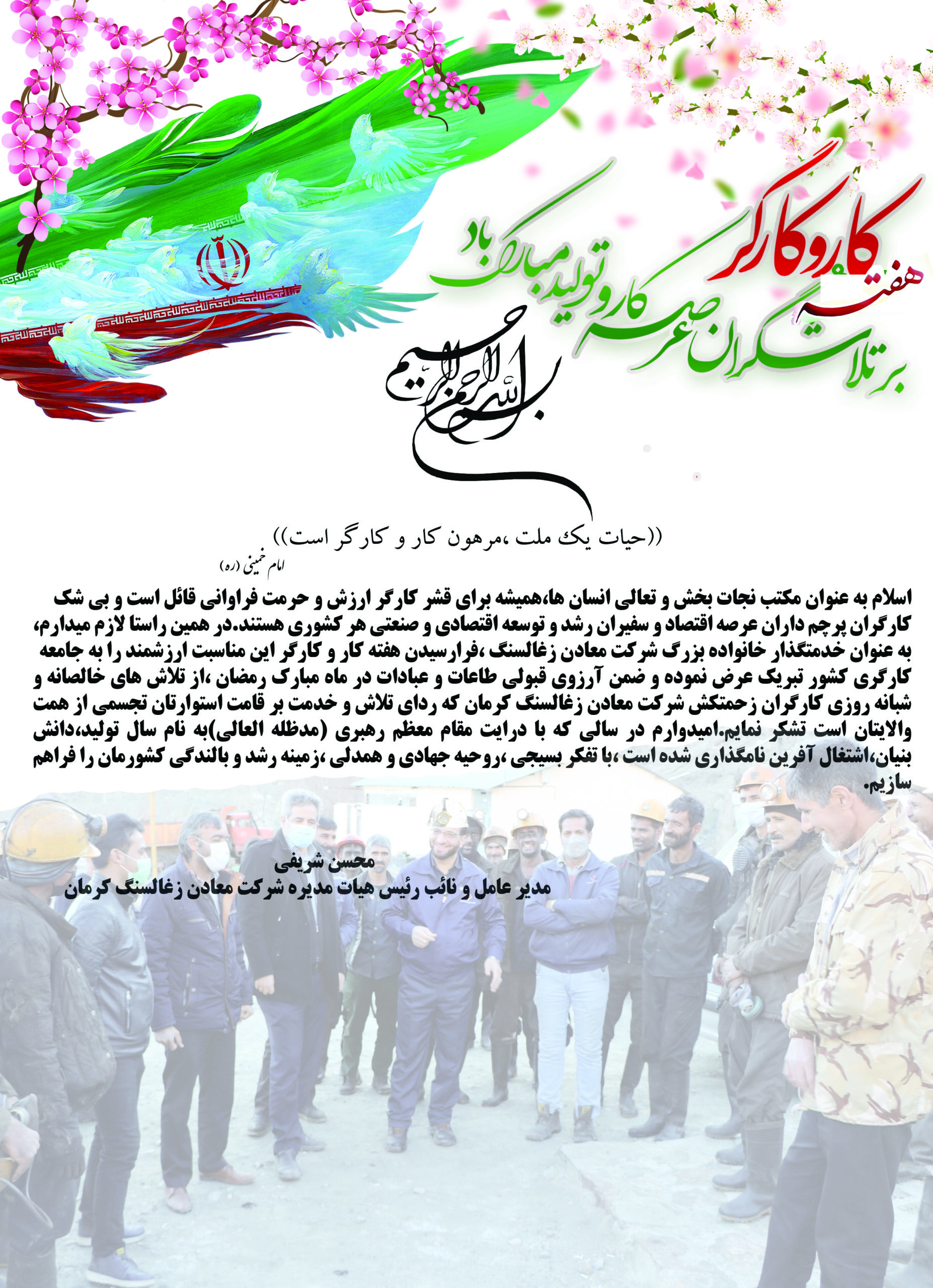 پیام تبریک مهندس شریفی مدیر عامل شرکت معادن زغالسنگ کرمان به مناسبت هفته کار و کارگر