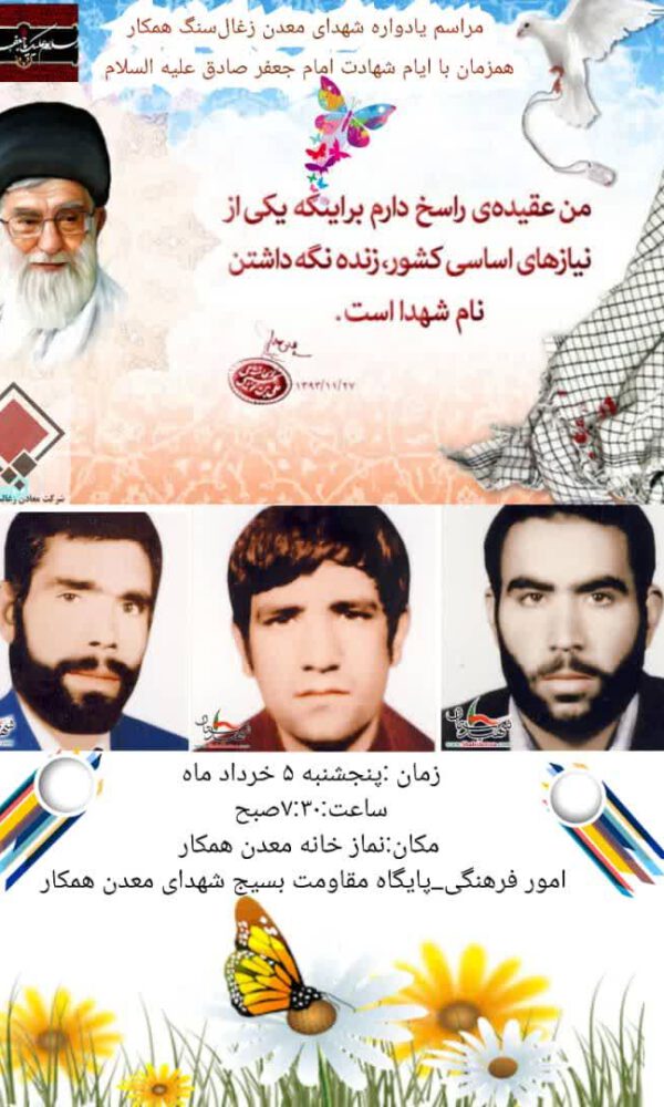 يادواره شهداي معدن زغالسنگ همكارTahanzadeh7 خرداد 1401همزمان با ايام شهادت حضرت امام جعفرصادق عليه السلام مراسم يادواره شهداي معدن همكار با حضور كارگران در نماز خانه معدن برگزار گرديد. ... ادامه مطلب