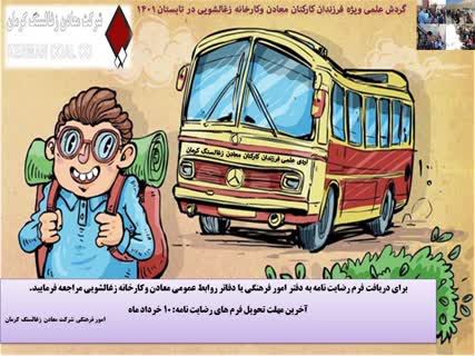 قابل توجه همكاران محترم با توجه پايان پذيرفتن مهلت ثبت نام گردش علمي فرزندان شما براي مناطق معدني وكارخانه زغالشويي ,بدينوسيله به اطلاع مي رساند از طريق دفتر امور فرهنگي شركت يا سامانه پيامكي امور فرهنگي زمان اردو اطلاع رساني مي گردد.