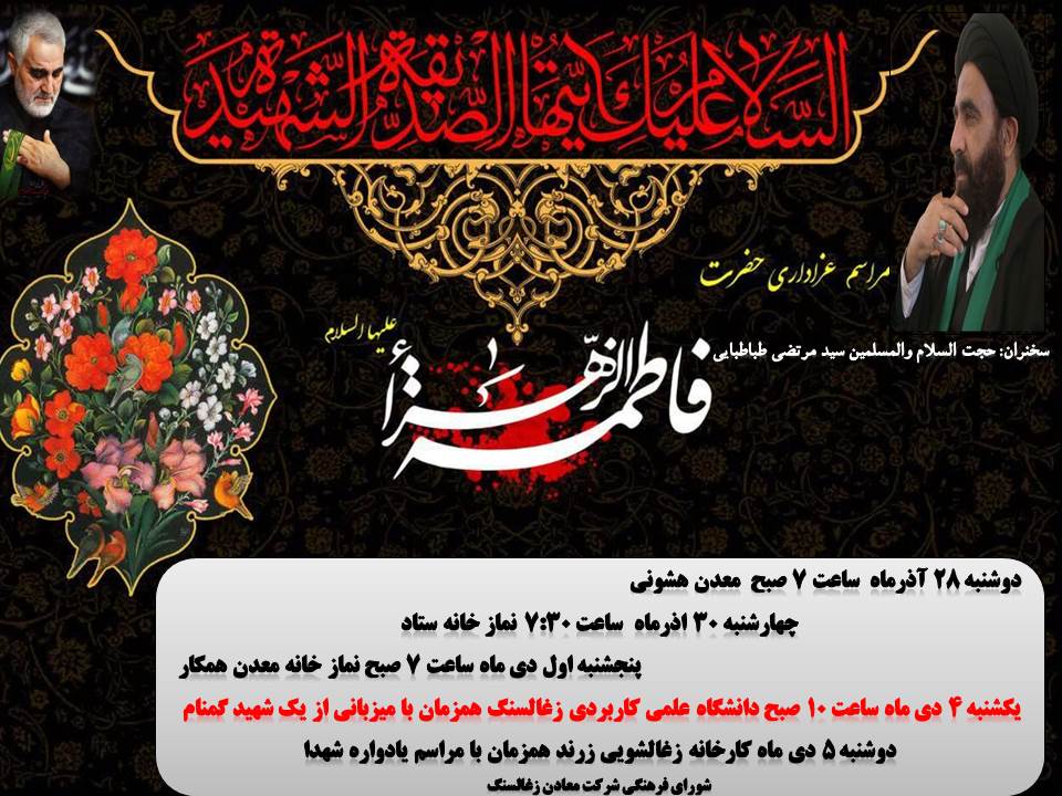 به گزارش دفتر امور فرهنگي شركت همزمان با فرارسيدن ايام فاطميه مراسم سوگواري همراه با سخنراني حجت السلام والمسلمين سيد مرتضي طباطبايي در واحدهاي كارگري زغالسنگ برگزارمي گردد.