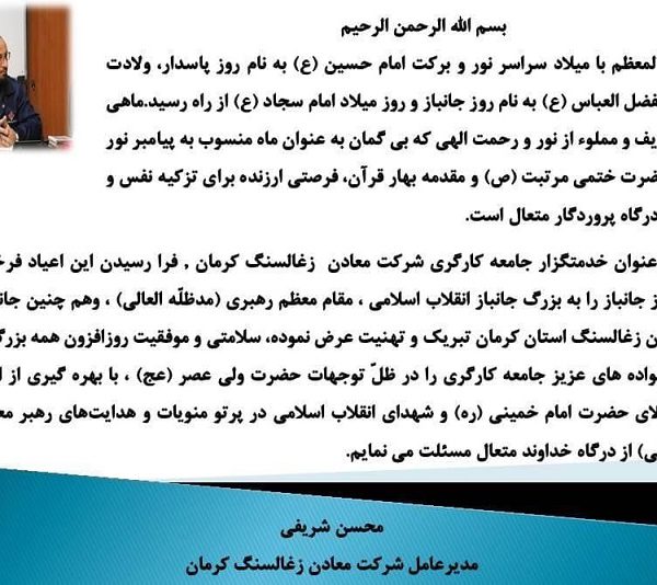 پیام تبریک مدیرعامل شرکت معادن زغالسنگ به مناسبت فرارسیدن ماه شعبان المعظمHanjari14 اسفند 1400پیام تبریک مدیرعامل شرکت معادن زغالسنگ به مناسبت فرارسیدن ماه شعبان المعظم ... ادامه مطلب