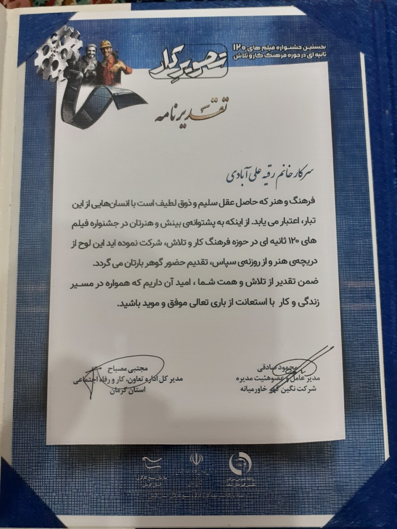 ❇️تقدیر نامه به سرکار خانم رقیه علی آبادی فرزند احمد (معدن همکار)در نخستین جشنواره فیلم های 120ثانیه ایی حوزه کار وتلاش