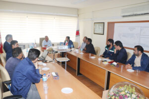 ایشان در ادامه در جلسه ای که با حضور مدیر و کارشناسان معدن در دفتر برگزار گردید حضور یافتند . در ابتدا فتاحی مدیرمعدن به ارائه گزارشی از افق های قابل کار معدن ، طرح های توسعه ای و مسائل و مشکلات در رابطه با تولید پرداخته و برای حل این موضوعات به بحث و گفت و گو پرداختند.