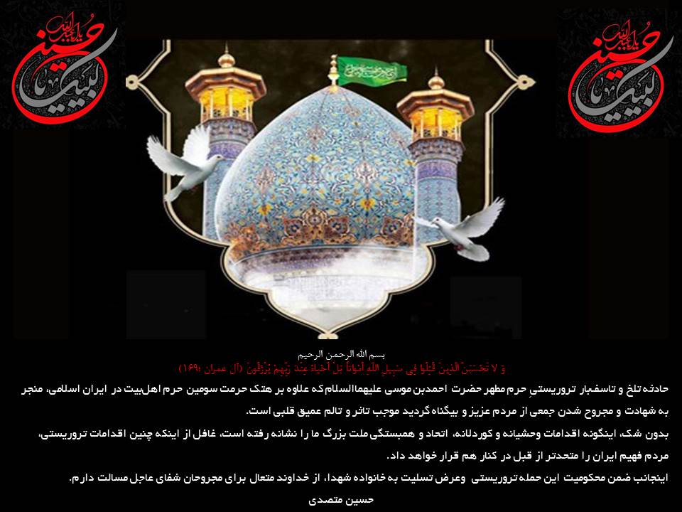 حادثه تلخ و تاسفبار تروریستیِ حرم مطهر حضرت احمدبن موسی علیهماالسلام که علاوه بر هتک حرمت سومین حرم اهلبیت در ایران اسلامی، منجر به شهادت و مجروح شدن جمعی از مردم عزیز و بیگناه گردید موجب تاثر و تالم عمیق قلبی است.