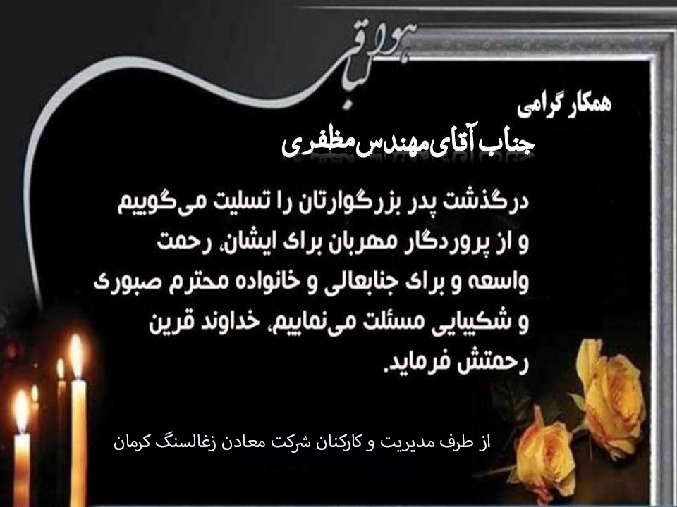 با نهایت تأسف و تأثر ضایعه در گذشت پدر گرامیتان را خدمت شما و خانواده محترم تسلیت عرض می‌کنیم. بقای عمر با عزت برای شما و همچنین رحمت واسعه برای آن مرحوم را از خداوند متعال خواستاریم.