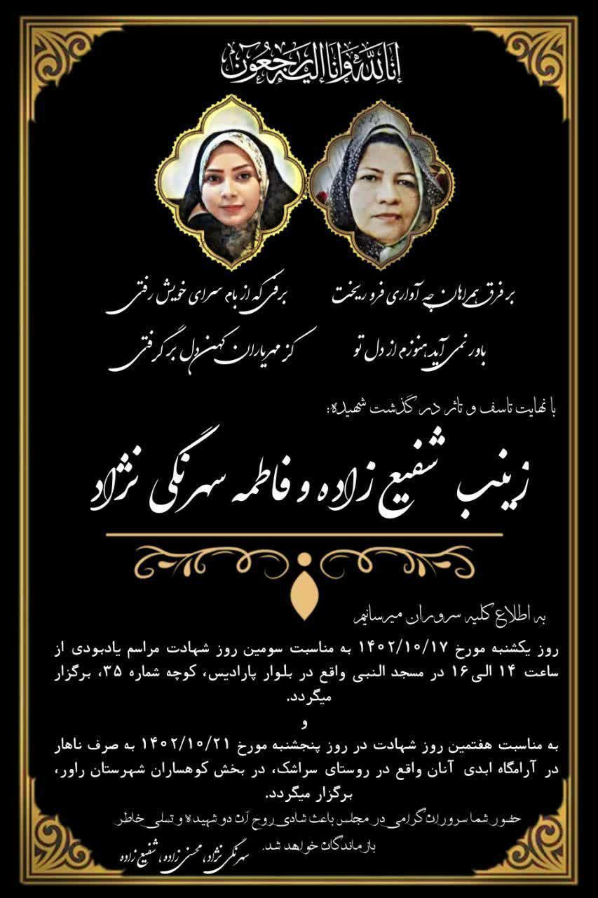جهت اطلاع همکاران: مراسم هفتمین روز شهادت دو شهیده حادثه تروریستی سالگرد مراسم سردار دل ها شهید حاج قاسم سلیمانی فردا (پنجشنبه)در روستای سراشک از توابع بخش کوهساران شهرستان راور برگزار می گردد.