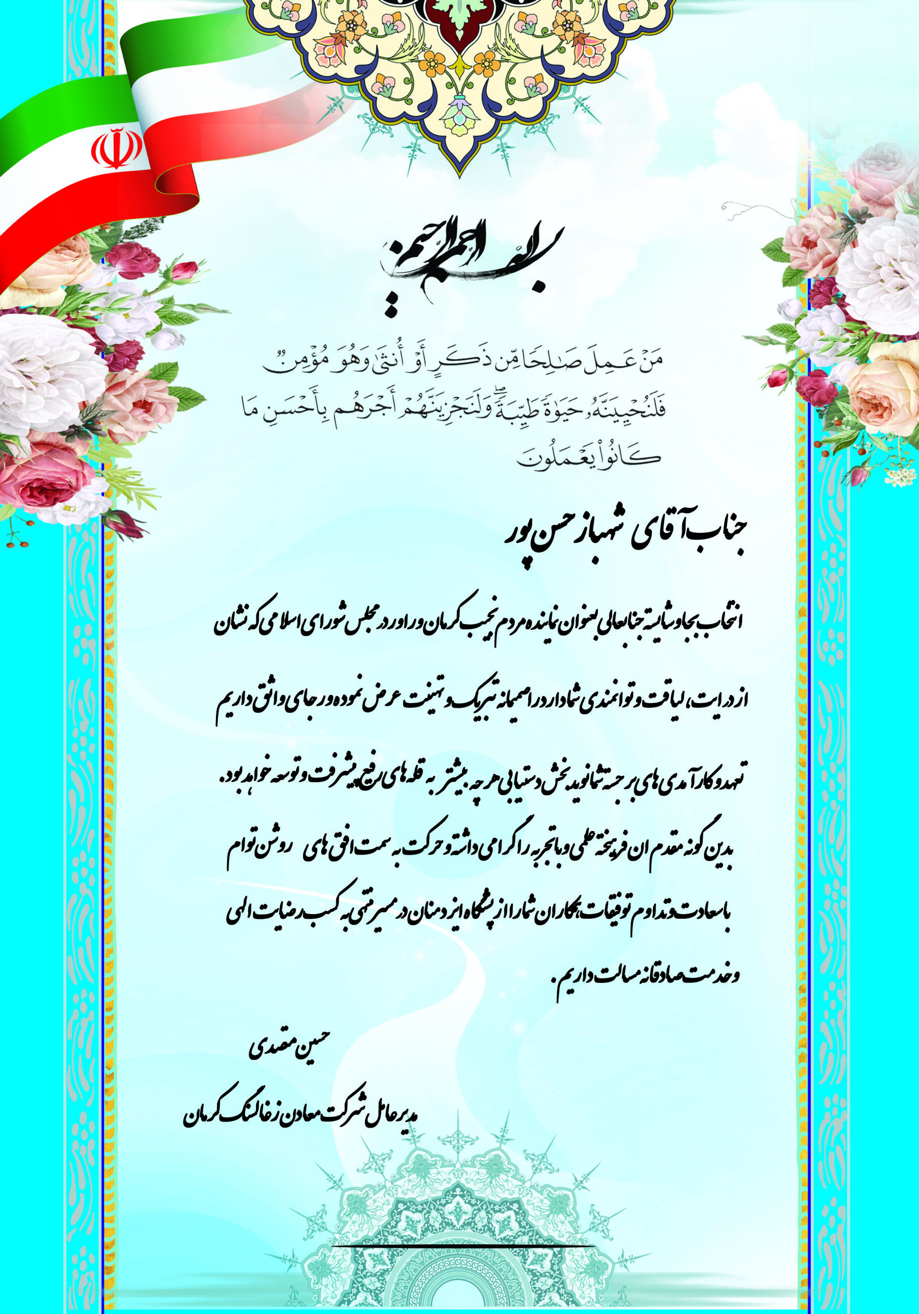 پیام تبریک مهندس متصدی مدیر عامل شرکت معادن زغالسنگ کرمان به جناب آقای شهباز حسن پور نماینده محترم مردم نجیب کرمان و راور در مجلس شواری اسلامی