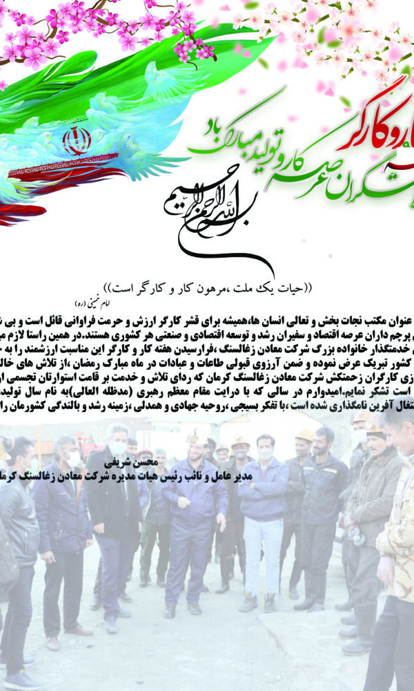 پیام تبریک مهندس شریفی مدیر عامل شرکت معادن زغالسنگ کرمان به مناسبت هفته کار و کارگرHanjari7 اردیبهشت 1401پیام تبریک مهندس شریفی مدیر عامل شرکت معادن زغالسنگ کرمان به مناسبت هفته کار و کارگر ... ادامه مطلب